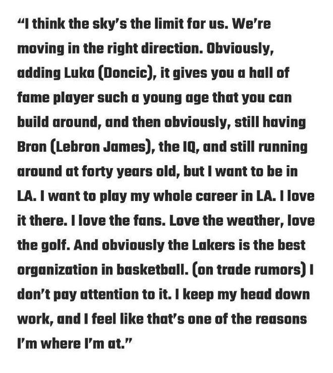里夫斯继续表忠心:“我想留在洛杉矶,只是如果球队选中交易我,这是我无法控制的事情,我会在其他地方重新开始篮球生涯。正如我所说,我渴望留在洛杉矶,我渴望在这里打完整个职业生涯。”
